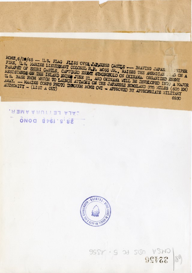 Un Marine sta per issare la bandiera americana sulla cima del castello Shuri, sull'isola di Okinawa.