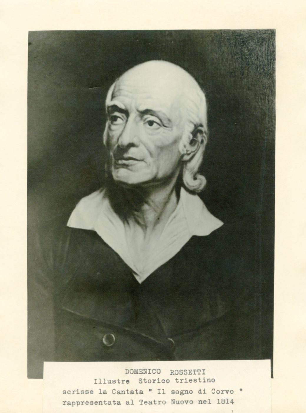Fotografia del dipinto, del 1893, di Franco Armani. inv. CMSA 13/2886 SART QUAD GR 53A. Il Conte Domenico Rossetti de Scander fu un avvocato, un uomo politico, un mecenate ed un erudito di formazione classicista. Nel 1880 si laurea in giurisprudenza, nel 1802 fu assunto al Comune, nel 1818 Procuratore civico, fonda il Gabinetto di Minerva nel 1810, l'Archeografo Triestino nel 1829 . La citta' gli eresse un monumento nella via ora Giulia, davanti l'ingresso del giardino pubblico, ancora esistente e gli intitolo' una importante via che passava sul suo terreno e il Teatro Politeama. Domenico Rossetti donò alla città di Trieste, nel 1842, la collezione di libri antichi, manoscritti miniati, stampe ed opere d'arte, e documenti del vescovo di Trieste (poi Papa, con l'appellativo di Pio II) Enea Silvio Piccolomini. Rossetti si prodigò per innalzare un monumento alla memoria di Winkelmann, ucciso a Trieste all'interno della Locanda Grande. Diede incarico, quindi allo scultore bassanese Antonio Bosa e il suo maestro Antonio Canova di realizzare l'opera che fu collocata nel 1833 nel cimitero della Cattedrale di Trieste, oggi Lapidario. Nelle intenzioni di Rossetti, il monumento a Winkelmann avrebbe dovuto essere il nucleo di un futuro Museo. Nel 1808 Rossetti fece sistemare, contribuendo anche finanziariamente, del "passeggio" nella zona dell'acquedotto teresiano (fatto costruire da Maria Teresa, inaugurato nel 1749).