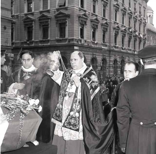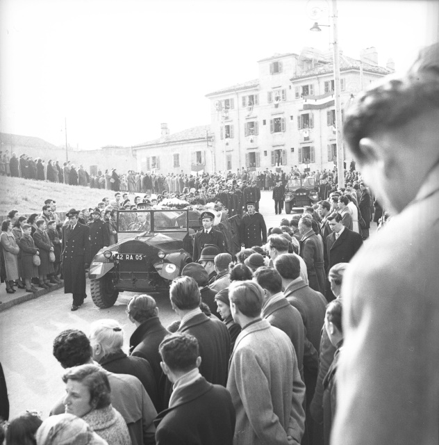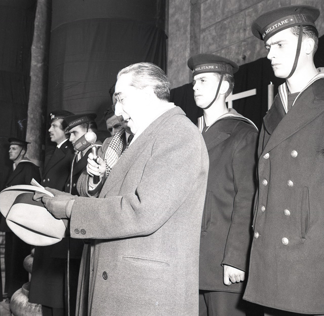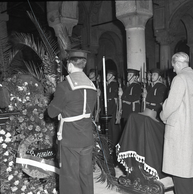 Cerimonia funebre per le salme dei cinque marinai della nave da guerra Berenice affondata il 9 settembre 1943 dalle truppe tedesche nel golfo di Trieste, e recuperate nei mesi di gennaio e febbraio del 1951