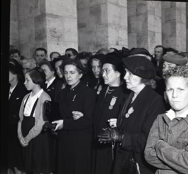 Folla presenzia alla cerimonia di inaugurazione dell'Ara Pacis Mundi di Medea. Cartellone sul muro di una casa: Sottocentro fecondazione artificiale. Uomo al volante di un'automobile