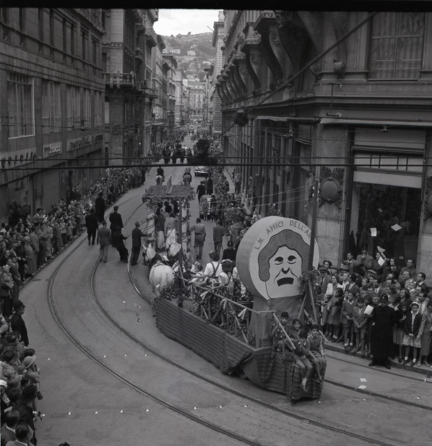 Sfilata di carri allegorici per le vie del centro; Ketty Burba, Miss Trieste 1951, in posa accanto ai grappoli; festa al castello di San Giusto.