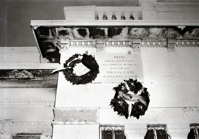 Due corone appese e una targa recante: Primi dalle navi d'Italia all'amplesso di Trieste balzarono i Bersaglieri III novembre MCMXVIII