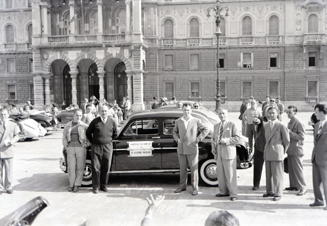 Un automobile in piazza dell'Unità con attaccati sulla portiera i cartelli Giornale di Trieste e Le ultime notizie