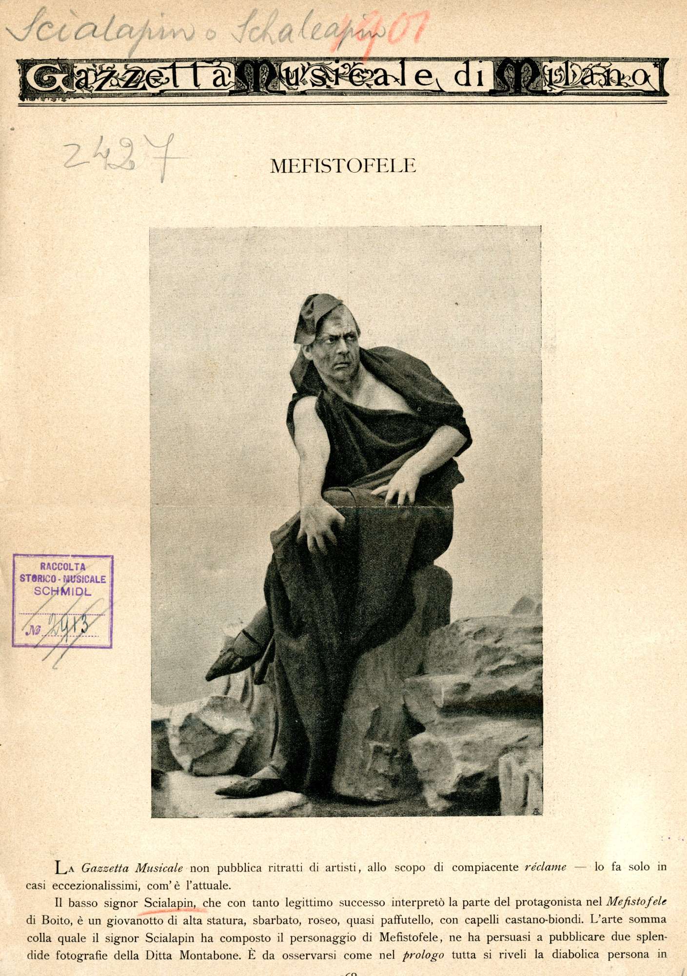 Fëdor Ivanovič Šaljapin (1873-1938). Il suo cognome viene traslitterato dal cirillico anche come Chaliapin o Shalyapin ed è stato un cantante lirico russo. Šaljapin ha con l'Italia un rapporto intenso, che si sostanzia di legami professionali, familiari e d'amicizia. A partire dal 1901, quando debutta a Milano nel Mefistofele di Boito, prima tappa della sua sfolgorante carriera internazionale, torna in Italia con regolarità fino al 1913, alternando agli impegni di natura professionale soggiorni a Monza, dove gli Šaljapin hanno una casa di proprietà. Ma una delle ragioni che lo attraggono più frequentemente in territorio italiano è l'amicizia con Maksim Gor'kij, che va spesso a trovare a Capri. Il cantante interrompe i suoi frequenti viaggi in Italia nel 1913, anno in cui Gor'kij rientra in Russia, per riprenderli con regolarità nella seconda metà degli anni Venti fino al 1937, anno precedente a quello della sua morte.
