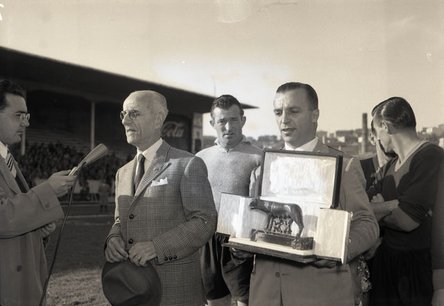 La squadra romana consegna la lupa in bronzo con una targa sulla quale sono espressi i sentimenti degli sportivi romani auspicando il prossimo ricongiungimento di Trieste all'Italia. Testo tratto dal Giornale di Trieste, 1.11.1953