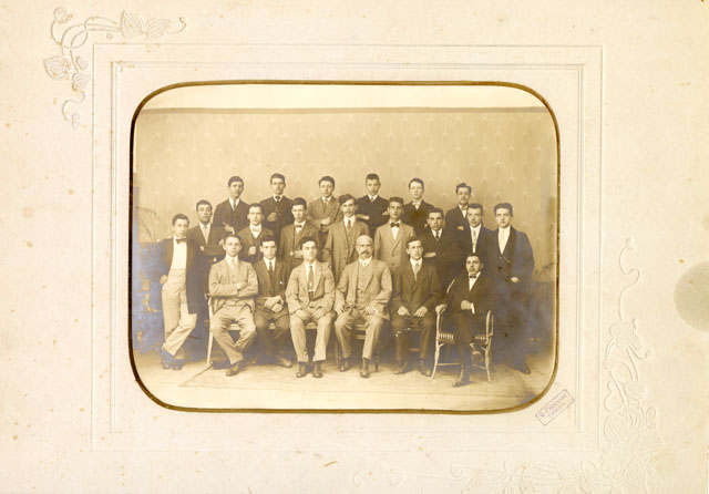 Il fotografo ritrae i personaggi presso il gabinetto dello studio, addossati su un fondale.