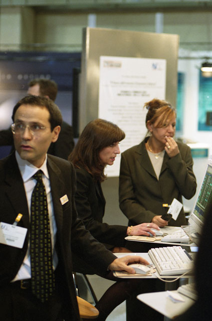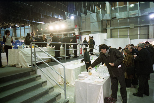 Fiera di Trieste: convegno economia (02/02/01), computer, pranzo, colazione. Esterni fiera, panoramiche.