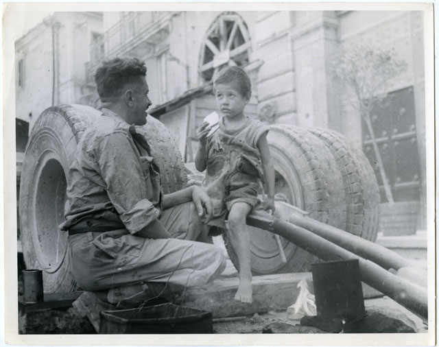 Un soldato da da mangiare ad un bambino