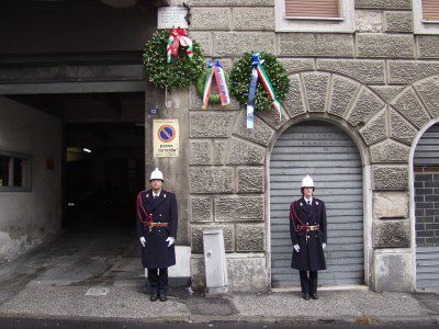 L'assessore Fulvio Sluga ed il consigliere Silvano Magnelli commemorano con corone d'alloro le targhe ai Caduti del '53, ai Caduti del 5 maggio '53, la targa Beltramini '45, le targhe ai Caduti antinazisti del '44 ed ai 41 martiri antifascisti del '44