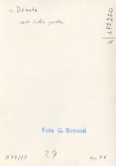 Resti della porta medievale di via Donota. La porta, che si trovava in linea retta sopra quella di Riborgo, con la quale formava il complesso fortificato di Donota-Riborgo, rappresentava uno dei principali accessi alla città e conduceva direttamente al colle di San Giusto.Nel medioevo la porta era sormontata da una torre merlata a pianta quadrata datata nel Trecento, era munita di un ponte levatoio e di un fossato riempito d'acqua che si estendeva lungo quasi tutto il perimetro di difesa.In seguito allo sviluppo urbano ottocentesco l'area antistante alla torre è stata circondata da diversi edifici, diventando l'attuale piazza Donota.