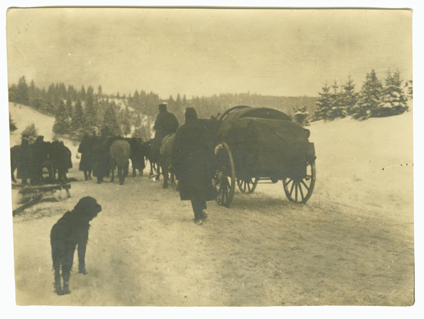 Truppe tedesche - Deutsche Jäger - passano per il paese. Nel maggio 1915 l'Esercito imperiale tedesco cominciò ad unire i vari Battaglioni Jäger prussiani, sassoni e bavaresi per formare i Reggimenti Jäger, e nel 1917 venne costituita la Deutsche Jäger Division. Gli Jäger (cacciatori) erano delle unità di infanteria leggera col compito di ricognitori e disturbatori. Nella guerra di trincea vennero però usati come semplice infanteria, perdendo lo status di unità indipendenti.