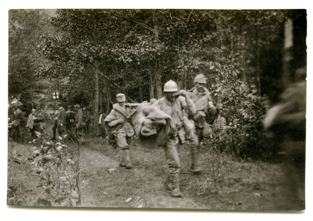 Tra l'8 e il 20 agosto 1917 il Reggimento Ulani n. 12 prende parte alla seconda Battaglia di Oituz. Nella foto i feriti del Reggimento vengono trasportati al primo soccorso da prigionieri romeni. Durante la notte tra l'8 e il 9 agosto il 4. Corpo d'Armata romeno aveva contrattaccato nelle zone tenute dai tedeschi, facendo 200 prigionieri e riguadagnando un po' del terreno perso il giorno prima. Ma nel pomeriggio del 9, le forze austro-tedesche attaccheranno in forze conquistando la cima Pravila e arrivando fino al monte Coșna. La 7. Divisione di infanteria romena dovette ritirarsi su una nuova linea difensiva.