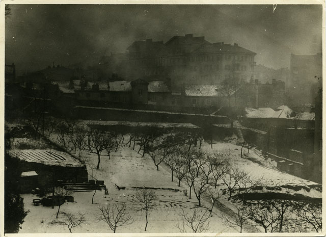 Veduta dell'area archeologica antistante al Museo civico di Storia e Arte di Trieste innevata. La fotografia è stata scattata durante l'inverno a cavallo tra il 1946 e il 1947.