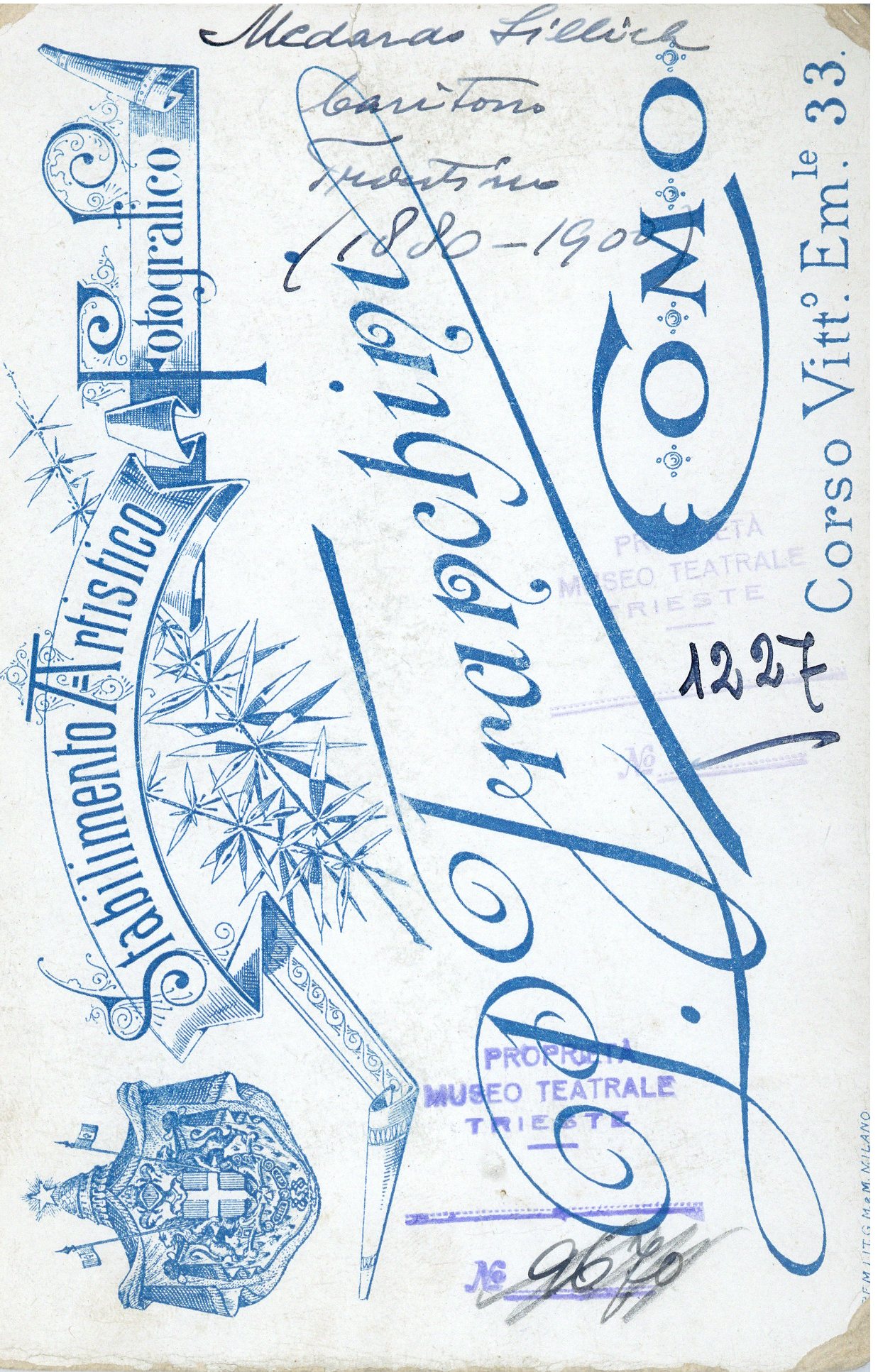 In costume nel ruolo di Carlo in "Ernani". Cantò al Politeama Rossetti di Trieste in concerto di beneficenza il 12.12.1888 , e il 15.11.1901 in concerto con la violinista Teresina Tua. Nel 1889 a Parma nella "Carmen" e alla Scala di Milano in "Simon Boccanegra"; nel 1895 in "Ruy Blas" e "Ernani" al Teatro Cressoni di Como