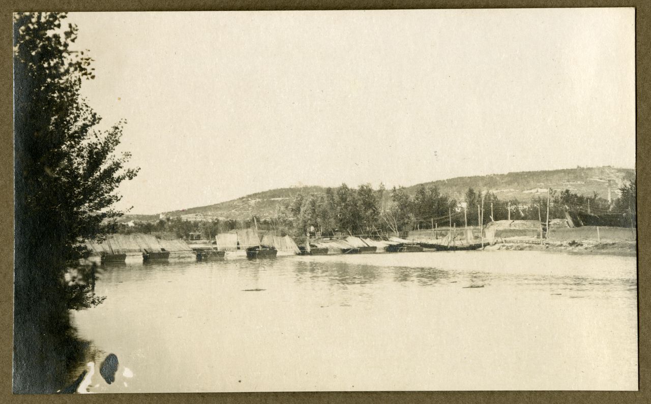 La foto ritrae il ponte di barche sul fiume Isonzo.