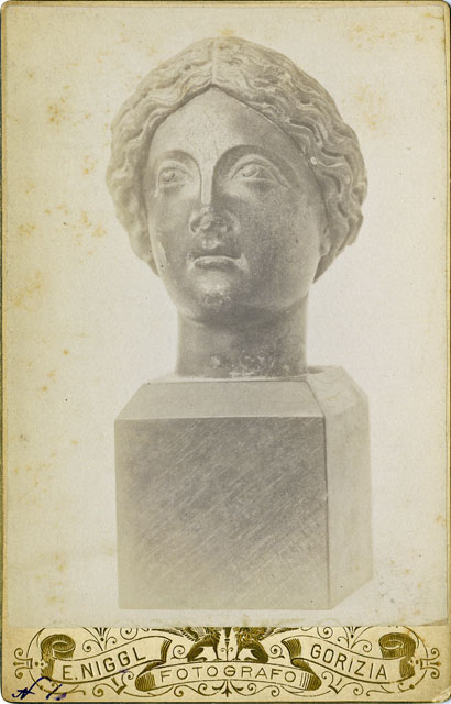 Testa femminile con parrucca mobile di piccole dimensioni (9,5 cm) realizzata in basalto. Si tratta di un ritratto idealizzato di giovane donna alla quale i tratti fisionomici ben marcati - quali il volto largo, gli occhi leggermente sporgenti con le pupille e le iridi incise, le labbra leggermente socchiuse - conferiscono volutamente un "carattere" che la distanzia dalla fissità propria dei tipi di divinità. Dibattuta è la sua identificazione e cronologia: G. Brusin la ritiene un "tipo ideale, generico" di fine II sec. d.C. mentre F. Squarciapino ne propone un'attribuzione all'età antonina e vi riconosce, per confronto con la statuaria di dimensioni maggiori, il ritratto di Faustina Minore. La studiosa collega inoltre la diffusione di queste piccole immagini al culto dei lari, per il quale sovente si ricorreva ai genii degli imperatori. La fotografia ritrae il medesimo soggetto della foto F17084, alla quale si rimanda per ulteriori considerazioni. La fotografia è stata utilizzata da V. Scarpa per realizzare il disegno pubblicato nel volume di Caprin, "Pianure friulane" (1892), che la riproduce a fianco del soggetto della foto F17084.