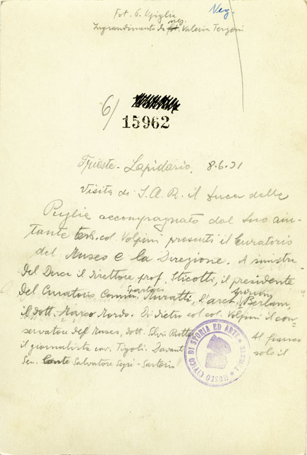 Visita di Sua Altezza reale il duca della Puglia all'Orto Lapidario di Trieste in data 8 giugno 1931. Lo accompagnano il suo aiutante tenente colonnello Volpini al cospetto del duca il direttore prof. Sticotti, il presidente del curatorio comm. Spartaco Muratti, l'architetto Arduino Berrlam e il dottor Marco Mordo. Lo seguono il colonnello Volpini e il conservatore del Museo dottor Silvio Rutter. Al suo fianco vi è il giornalista cavaliere Tigoli. Davanti a lui il senatore conte Salvatore Segrè Sartorio.