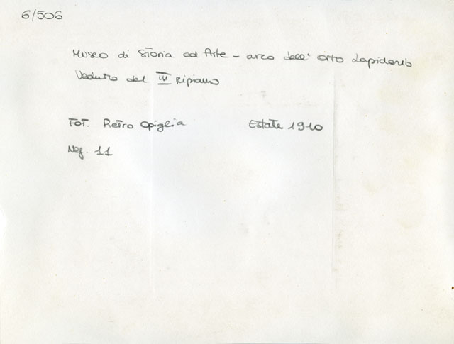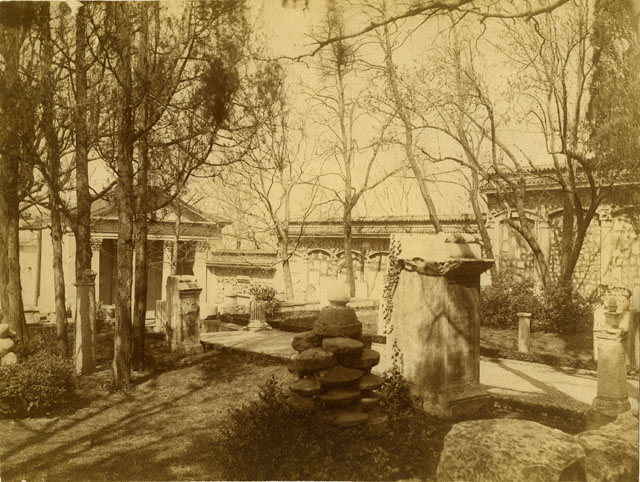 Veduta del terzo ripiano dell'Orto Lapidario dei Musei civici di Storia ed Arte di Trieste. In primo piano il camminamento tra le lapidi che attraversa il Lapidario e sullo sfondo il muro di cinta ad archi ciechi con le iscrizioni murate e il tempietto neoclassico che ospita il cenotafio di J.J. Winckelmann.