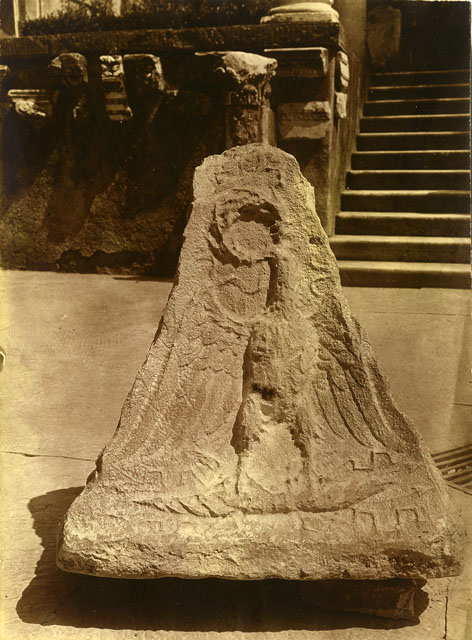 Trieste, Orto Lapidario : la piramide delle tre divinità capitoline, facciata con gli attributi di Giove, aquila, corona e fulmini