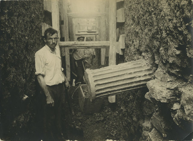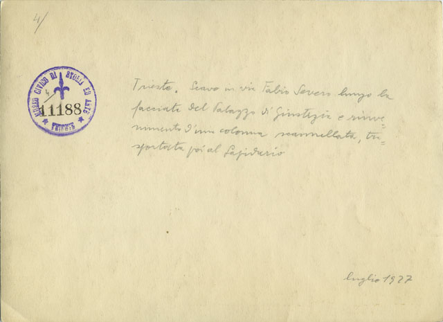 Durante i lavori di costruzione del palazzo di Giustizia, dalla parte della facciata sulla via Fabio Severo, si scopre il fusto. Lo scavo, disceso a tre metri di profondità, fa emergere la presenza di due muraglioni romani, uno scheletro privo di sepoltura e alcune monete Dalla sezione fuoriesce una colonna con fusto scanalato che, una volta liberata dalla terra, è stata trasportata all'Orto Lapidario del Museo di Storia ed Arte della città, dove è ancora oggi visibile.