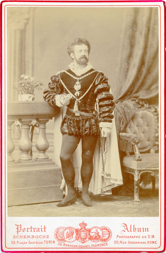 In costume, dalle note sul verso in " I Puritani" [teatro Regio di Torino nel 1877] o "Gli Ugonotti". A Trieste si è esibito al Teatro Comunale nel 1877 in "Gli Ugonotti", nel 1908 in "Il Battista", e nel 1912 in "Don Pasquale" e "L'elisir d'amore"; nel 1910 al Politeama Rossetti nel ruolo di Scarpia nella "Tosca"