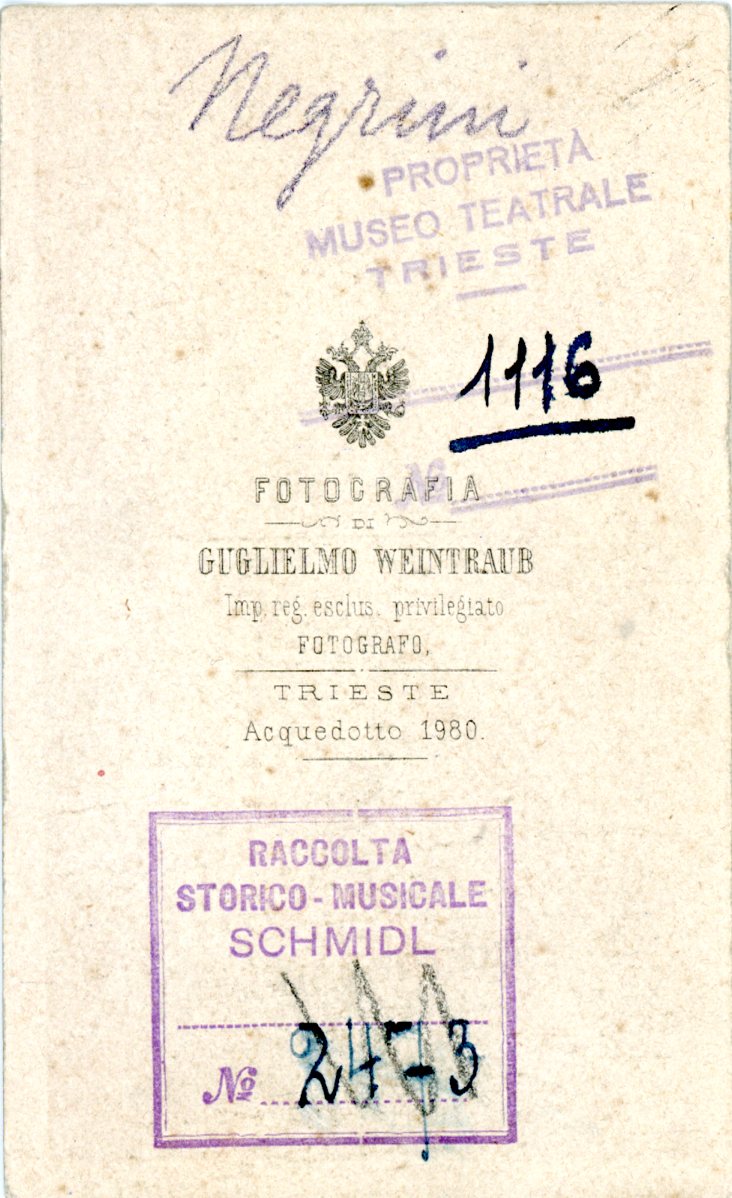 Si è esibito più volte al Teatro Verdi di Trieste tra il 1855 e il 1862/pIl costume indossato si riferisce al ruolo di Glauco interpretato nel 1862 in "Jone" di Enrico Petrella