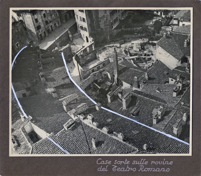 Foto scattata dalla sommità del grattacielo nel 1937, alla vigilia degli scavi per il recupero del teatro romano. La foto mostra le case sorte sui resti del teatro nell'area di Riborgo e Donota in Cittavecchia che verranno abbattute per riportare alla luce il monumento. Le linee bianche identificano il tracciato delle murature antiche rispettato dalle soprastanti costruzioni.