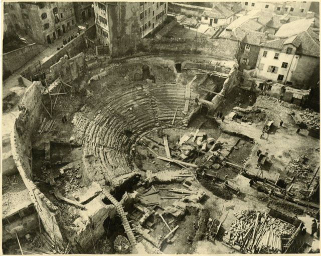 Il teatro romano in corso di scavo. La foto documenta il procedere del cantiere: si vede che è stata portata alla luce la cavea con le gradinate fino all'orchestra mentre la zona occupata dalla scena è in fase di scavo.