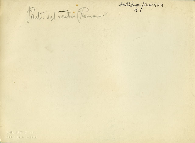 Scavo del teatro romano in Cittavecchia, tra le aree di Riborgo e Donota. La foto inquadra la porzione meridionale della cavea, di cui sono stati messi in luce il muro perimetrale e la parte più alta della gradinata dalla "summa cavea" fino ai primi gradini dell'"ima cavea", oltre la "praecinctio", ossia il corridoio semianulare che divide i due settori della gradinata. I gradini ripresi nella foto si collocano tra il terzo e il quarto "scalaria" partendo da est. Come si apprende dalla relazione mandata da l'ispettore che dirigeva le operazioni di recupero, il dott. B. Molajoli, a Rudolf Horn per la rivista Archäologischen Anzeiger del 1938, i gradini "erano in laterizi rivestiti di lastre di pietra". Nella foto sono ridotti per lo più al nucleo di opera incerta sul quale erano appoggiate le lastre lapidee.
