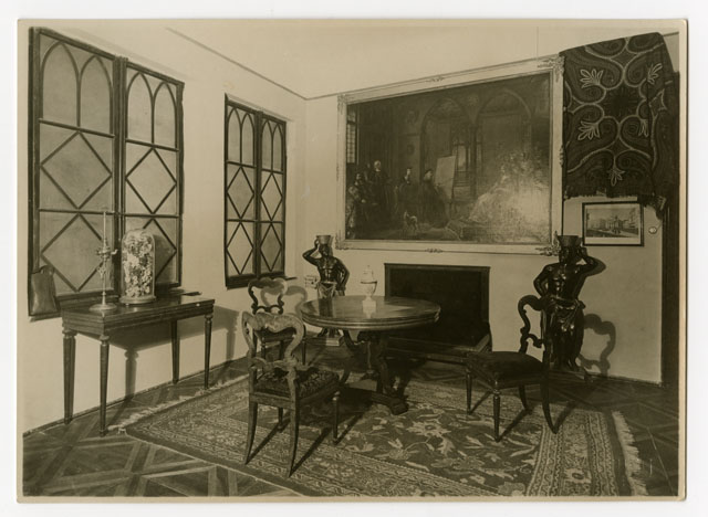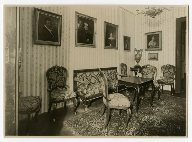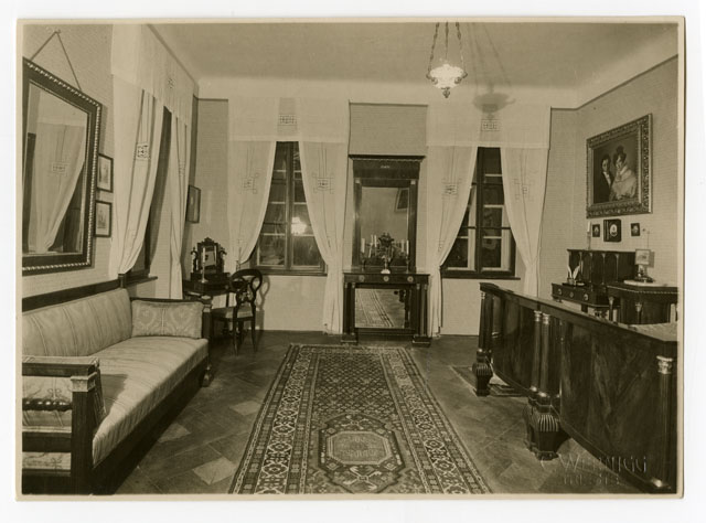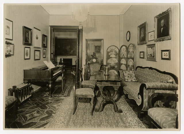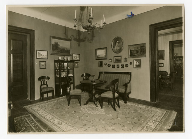 Mostra La casa dei nostri nonni : grande salone stile impero, camera da letto stile impero, anticamera, salottino di musica Biedermeier, salottino, salotto Biedermeier, camera da pranzo stile impero, salotto Biedermeier