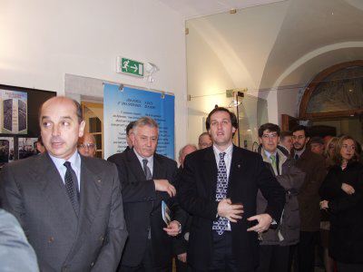 Primo piano della porta della pace, il sindaco Roberto Dipiazza, Roberto Menia, Giorgio Rossi e Padre Aldo Tonini