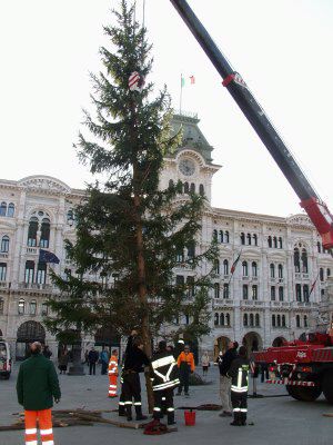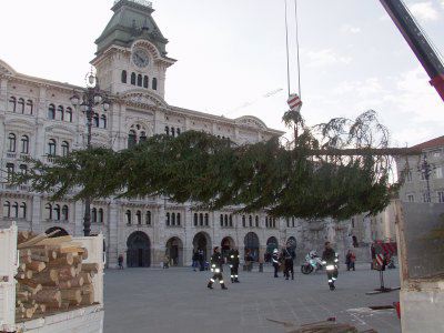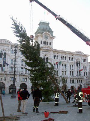 Operazioni per la posa dell'albero di Natale in piazza Unità d'Italia.