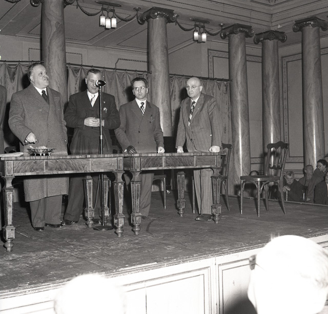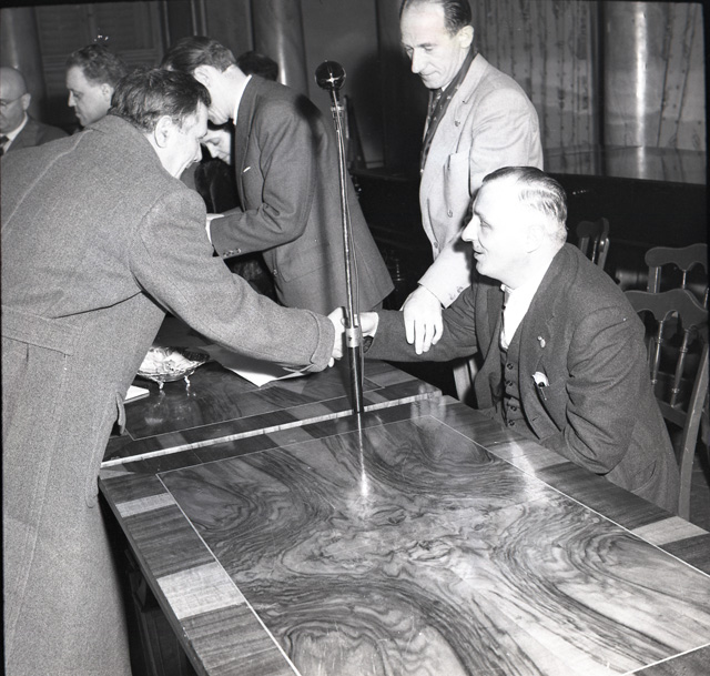 Celebrazione ufficiale il 19 marzo della Giornata nazionale del mutilato del lavoro al Ridotto del Verdi. Presente il grande invalido del lavoro, prof. avv. Filosi di Roma. Il prefetto Palutan, assistito dal direttore dell' INAIL dott. Benussi Gambel, distribuisce diplomi e distintivi agli invalidi e ai mutilati.