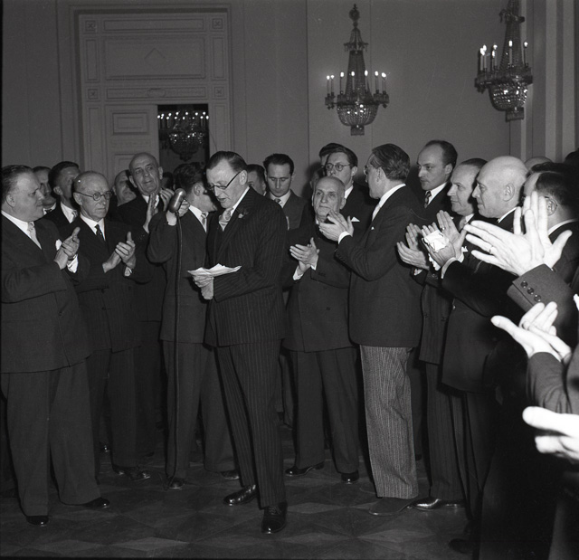 Con una solenne cerimonia in Prefettura, il maggior generale inglese sir Terence Airey si congeda dalle autorità politiche cittadine (da: Trieste 1900-1999: cent'anni di storia, v. 6, p. 184)