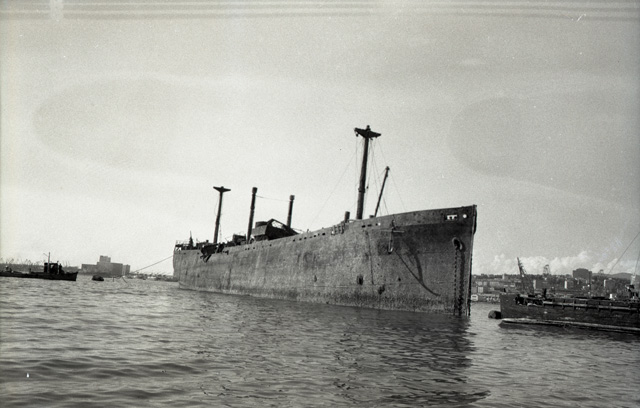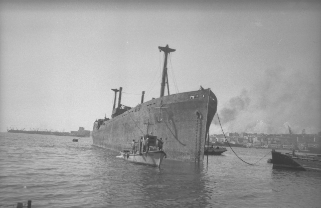 La motonave Gina, specializzata in recuperi marittimi, rientra nel porto di Trieste rimorchiando il relitto del piroscafo inglese Cavallo, affondato nei mari della Grecia nel 1941.
