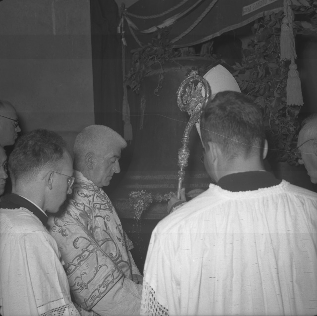Quarantasette nuove campane, in sostituzione di quelle requisite o distrutte durante la guerra, vengono benedette dal vescovo Santin davanti alla Chiesa di Sant'Antonio Taumaturgo
