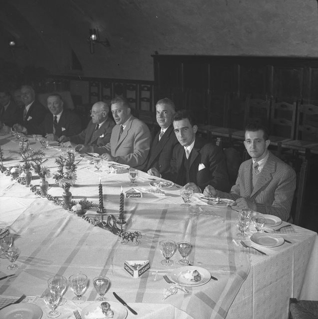 Presso la Bottega del Vino in Castello, un gruppo di esercenti triestini e di Gorizia, che si erano recati in visita agli stabilimenti della Casa Cinzano a Santa Vittoria d'Alba in Piemonte, offrono all' ispettore Zarpellan della Cinzano una campana di San Giusto adorna del tricolore e degli stemmi di Trieste e dell' Istria. Presente il comm. Felice Mezzari, consigliere nazionale della Federazione pubblici esercizi (dal Giornale di Trieste, 26.11.1952)