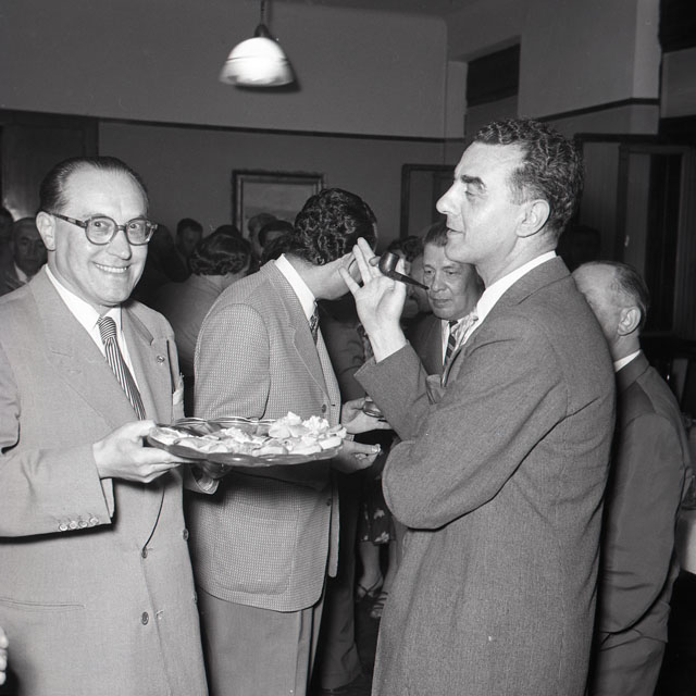 Gli industriali del legno festeggiano il capogruppo della categoria in seno all'Associazione industriali, Carlo Frandoli, insignito della commenda all'Ordine della Repubblica. Il dott. Dario Doria, presidente dell'Associazione, a nome di tutti gli industriali, offre a Frandoli l'insegna onorifica. (da: Giornale di Trieste, 20 giugno 1953)