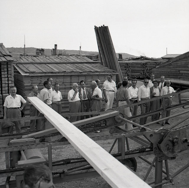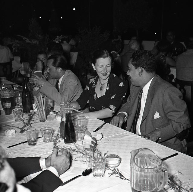 Visita dello stand della S.A. Forestale, lavorazione legnami. Gruppo di persone a cena