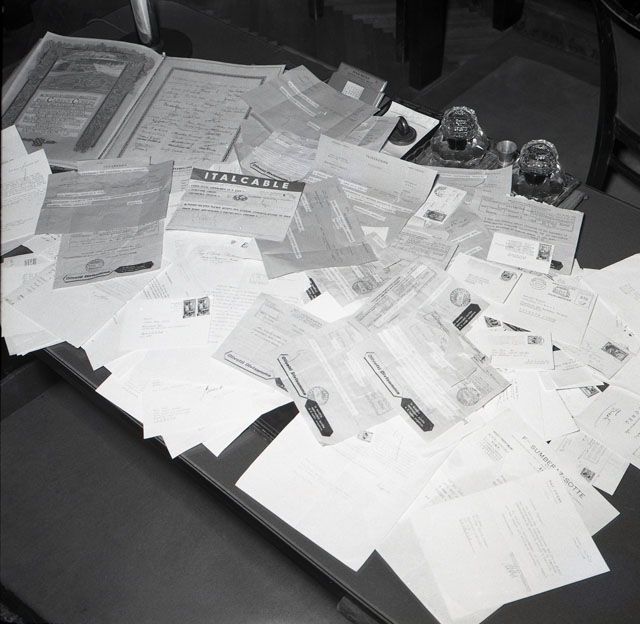 Documenti di lavoro sparpagliati su una scrivania. Gruppo di impiegati in posa all'interno di un ufficio. Pergamena celebrativa per il 40. di lavoro del direttore