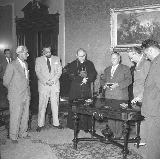 Congedo in forma ufficiale del dott. Renato Timeus, dal 1914 funzionario dell'amministrazione comunale di Trieste alla presenza del segretario generale del Comune Sacchi, del prof. Sciolis, del vescovo Santin e dell'ing. Visentin (Da: Rivista mensile della citta di Trieste, 10.9.1953)