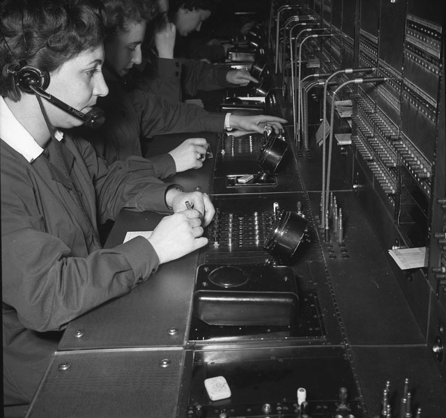 Telefoniste riprese durante l'attività lavorativa quotidiana e tecnici impegnati nell'allacciamento di nuove utenze.