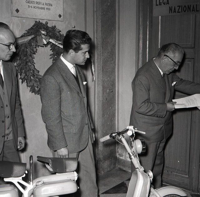 Il prof. Palin, presidente della lega Nazionale, riceve da Sergio Grandi, amministratore della Filotecnica Giuliana, commissionaria per Trieste della Innocenti, La Lambretta che la casa produttrice di moto ha donato al sodalizio. Testo tratto da Le ultime notizie, dd. 25.10.1954