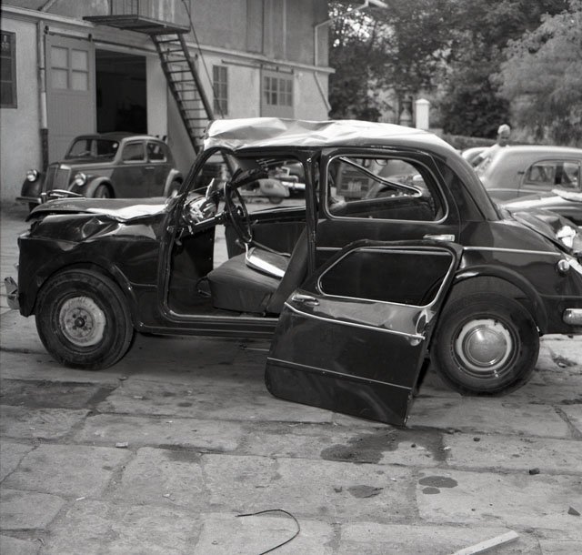 Immagini di una Fiat Millecento gravemente danneggiata.