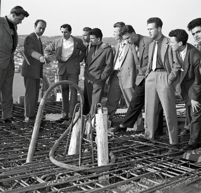 Gli studenti dell'Istituto tecnico industriale Alessandro Volta visitano la sede provinciale INAIL, di via del Teatro Romano, in costruzione. L'edificio, concluso nel 1957, è opera dell'arch. Romano Boico.