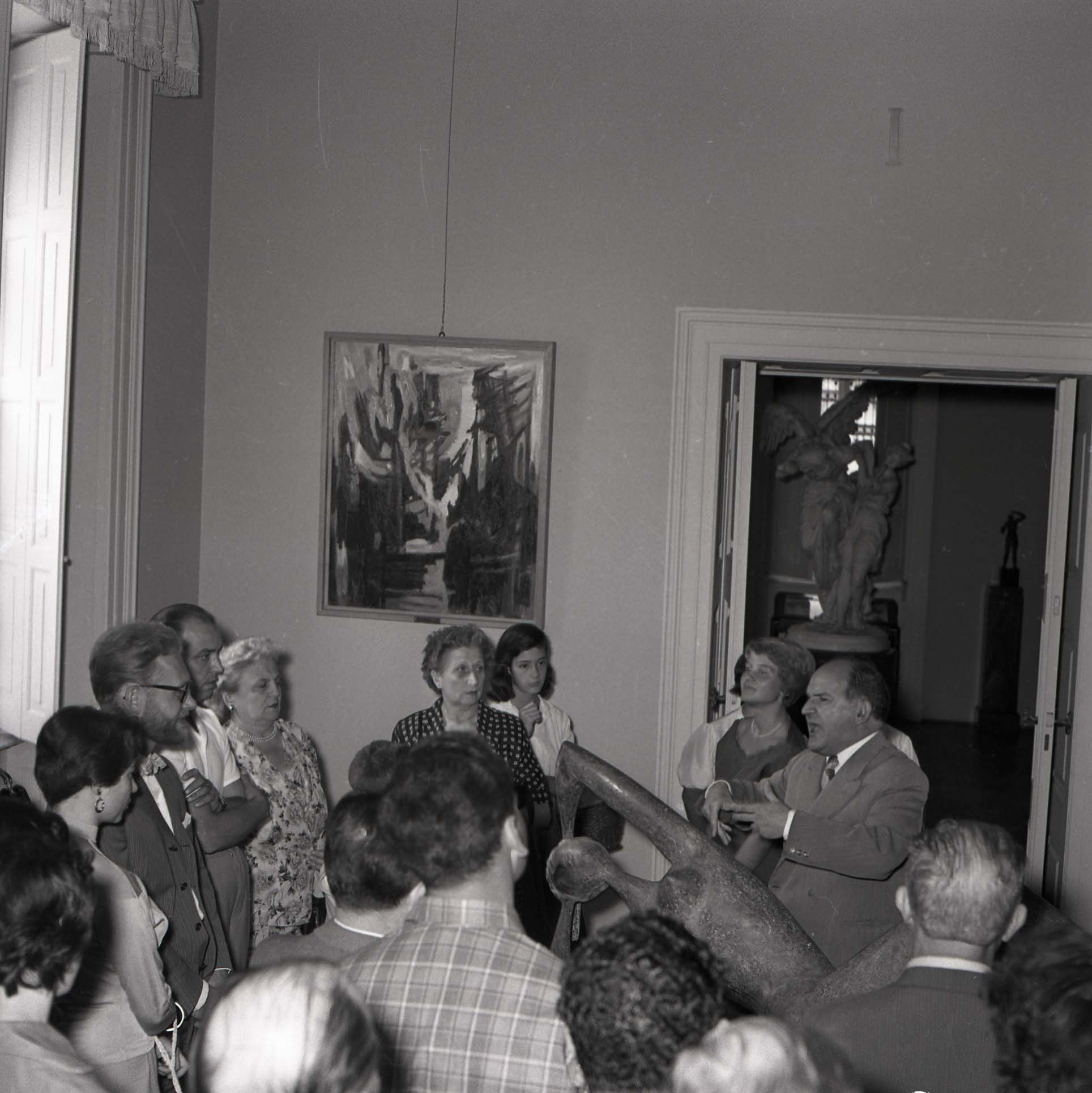 Il pittore Cesare Sofianopulo illustra una serie di opere esposte in una galleria d'arte.