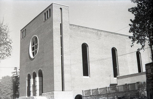 Nel bombardamento aereo del 10 giugno 1944 la chiesa della Beata Vergine delle Grazie (opera dell'arch. Carlo Polli, del 1924) in via Rossetti venne quasi completamente distrutta. La nuova chiesa, progettata dall'arch. Ramiro Meng, venne costruita tra il 1950 e il 1956 in stile neoromanico con accenti novecentisti, mediante l'utilizzo di mattoni a vista con elementi decorativi in pietra d'Aurisina e pietra d'Istria. Nel fotogramma è visibile lo scorcio della facciata con il grande rosone semplificato e le arcatelle stilizzate. Bibl. Massimo Mucci, Architettura e ricostruzione nel periodo del Governo Militare Alleato, p. 118-139, 186-187, in Trieste anni Cinquanta. La città delle forme, Trieste, 2004 e Massimo Mucci, Chiesa e convento della Beata Vergine delle Grazie, p. 281-283, in Paolo Nicoloso-Federica Rovello, Trieste 1918-1954. Guida all'architettura, Trieste, MGS Press, 2005