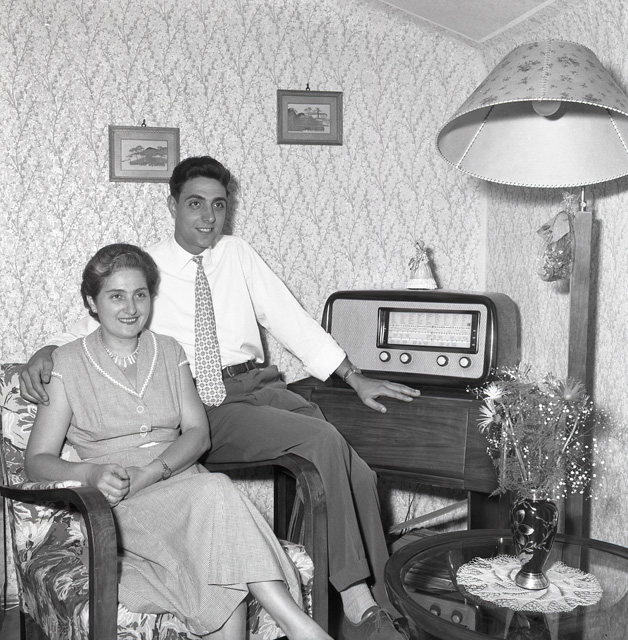 Madre e figlio ritratti in salotto vicino al radio e giradischi o mentre telefonano consultando la guida telefonica