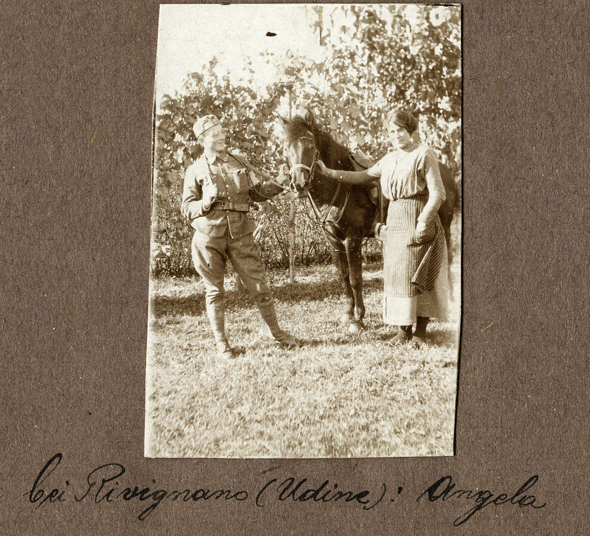 Le foto descrivono Mario Slavich in diverse occasioni. In divisa a cavallo, tra due commilitoni senza uniforme, con due soldati. A Rivignano con Angela. Mario, il primo a sinistra, un civile ed un gruppo di soldati davanti ad una caserma. Mario tra due soldati. Maria, Angela e Mario soldato con il bracciale della Croce Rossa. Ancora Mario mentre esegue una medicazione.Mario a figura intera