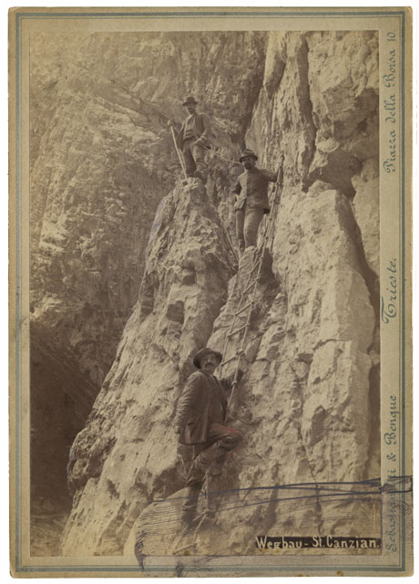 Tre grottenarbeiter (lavoratori delle grotte) su un sentiero attrezzato con scale di corda nella Grande Voragine (Velika Dolina) di San Canziano. Alla base della scala, in primo piano, è ritratto Joze Cerkvenik, una delle prime guide delle Grotte.